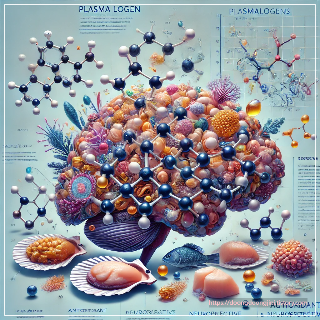플라즈마로겐은 우리 몸의 세포막을 구성하는 인지질의 일종으로, 특히 뇌 조직에서 높은 농도로 존재합니다. 이 성분은 항산화 작용과 세포 보호 기능을 가지고 있어, 인지 기능 유지와 신경 보호에 중요한 역할을 합니다.